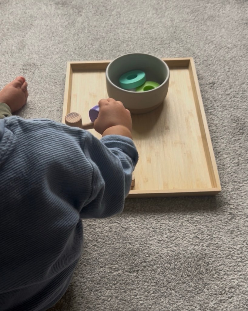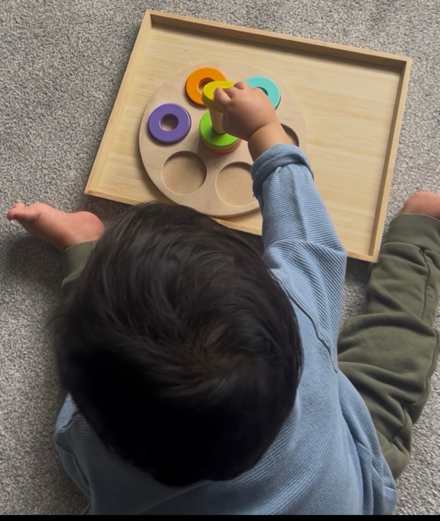 This ring and dowel work has been on his shelf for a while, always presented with the dowel vertically first. Over time, he became very comfortable with it. He would pick up a ring, align it, and place it down without hesitation. His hands knew what to do, and he could complete the work with ease.