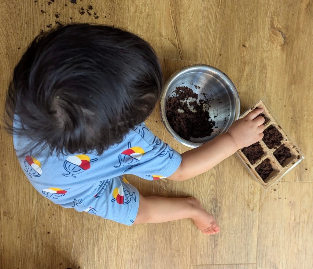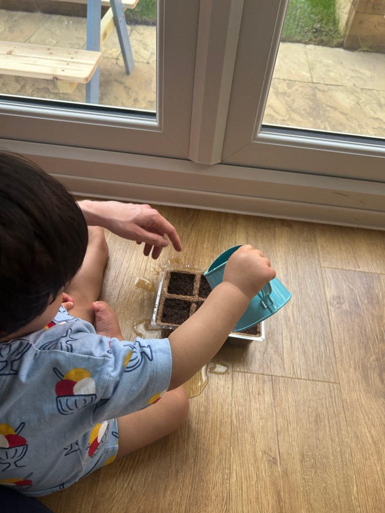 He was so into it from start to finish—scooping the soil, planting the seeds, and watering (a little enthusiastically). There was definitely a bit of mess, but that’s part of it.